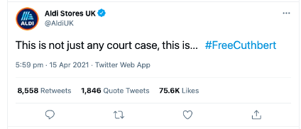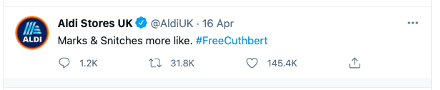Aldi’s Marketing team had a field day with Cuthbert. Taking to Twitter with vigour, Aldi executed a smart social strategy, with the intent to gain as much traction and press as possible. Their tactics were bold, coining new nicknames for the supermarket, creating a visual of Cuthbert the Caterpillar behind bars, and even using M&S’s slogan against them. These tricks worked in Aldi’s favor, increasing their awareness and boosting their Relevancy. Communicating in a human way and engaging with meme culture, made Aldi more relatable, and generated a lot of support for their cause.